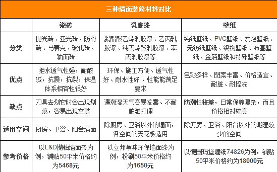 三種不同的建材各有其優缺點與適用的空間,針對不同的空間選擇適當的建材,也可針對個人的需求與經濟實力來挑選。從表格可以看到,一般來說乳膠漆的價格相對于壁紙與瓷磚是較為實惠的,而壁紙是價格較高的建材。